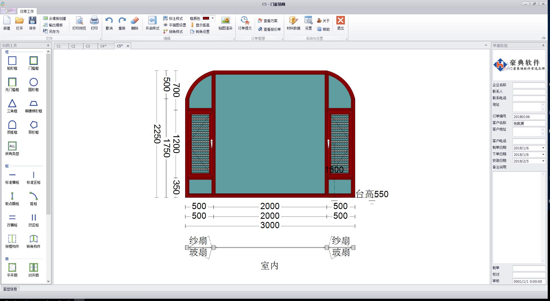 1) 窗型自由绘制:通过框、梃、扇等工具,快速绘制出各种分格的窗型,并可以通过设置半径功能设计出各种弧形分格;